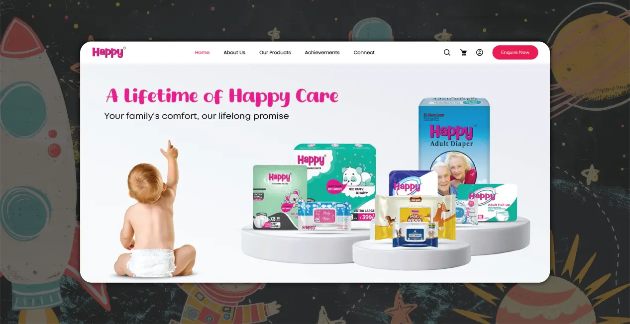 Online store for baby essentials like diapers and wipes, with seamless navigation, bulk order options, and strong brand appeal.