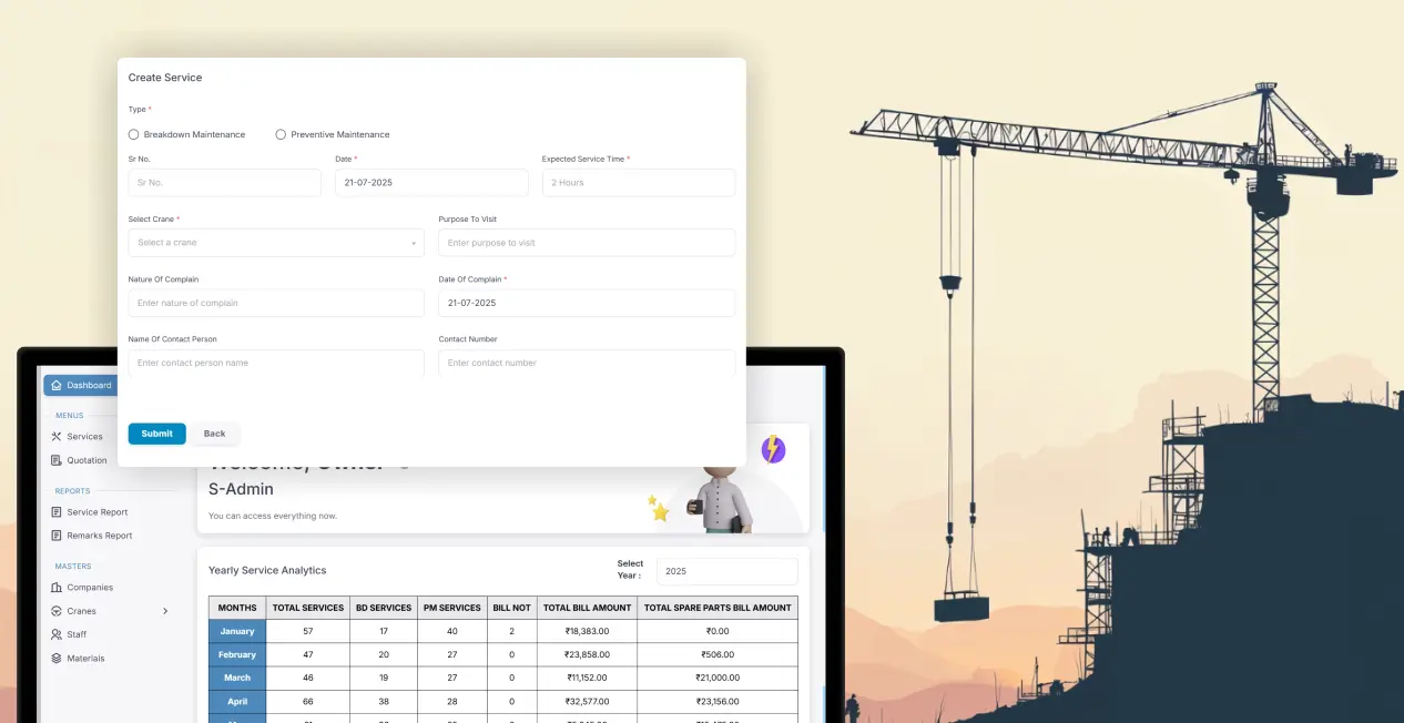 Custom software for a crane manufacturing company to manage production and track periodic and emergency maintenance services.