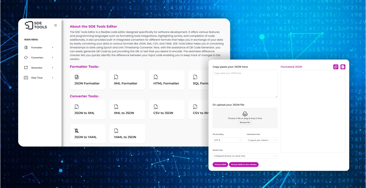 SDE Tools Editor is a powerful code editor with syntax highlighting, formatting, code completion, and built-in tools like format converters, QR generator, and diff checker.